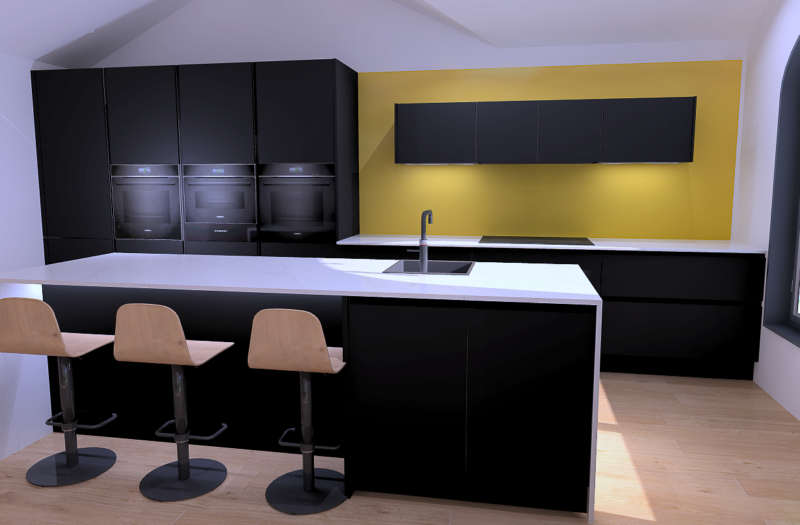 Matt envisions using Pure Joy as a splashback to break up a monochrome kitchen. Against sleek black cabinetry, it becomes a focal point that adds warmth and character without compromising the sophisticated feel. Picture the subtle drama of a Nolte Plus kitchen in black, with the vibrant pop of yellow lifting the entire design. It’s contemporary, yet filled with personality.