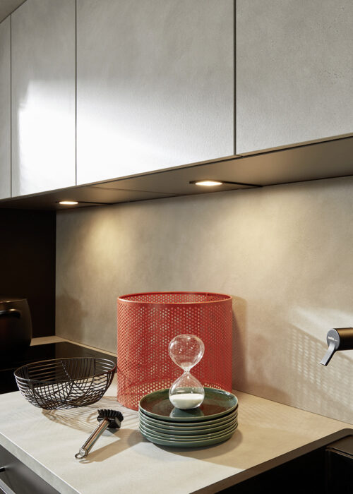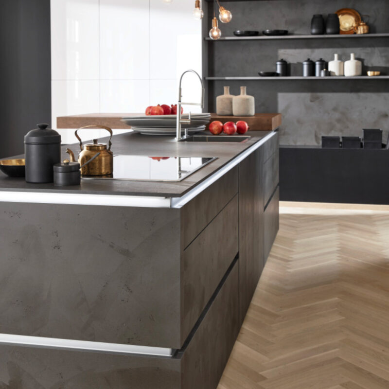 Lucca is perfect for creating a place for family gatherings, and having natural characteristics mean it works well with other natural materials such as metal, wood, glass and greenery. It’s available with or without handles, and its purist looks are offset by beautiful details such as illuminated finger pulls and shelf units. For the complete look, you can have the same cement look on your worktops as your fronts too.